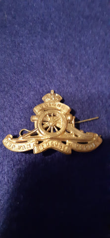 An original cap badge issued to the Royal Artillery (R.A.) during the Second World War. The brass badge is in beautiful condition with lugs on the reverse (the lugs are at an angle).