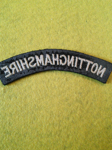 Very good rare original cloth shoulder title issued to the Nottinghamshire or Notts and Derbyshire Regiment (Sherwood Foresters) during WW2. The white embroidered Nottinghamshire is on dark green. Beautiful condition.