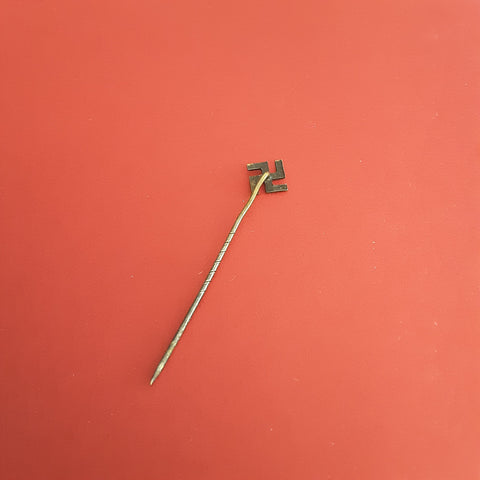 A small brass swastika on a stickpin, worn "in sympathy" with German Nazis. In good condition.