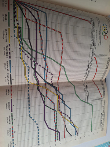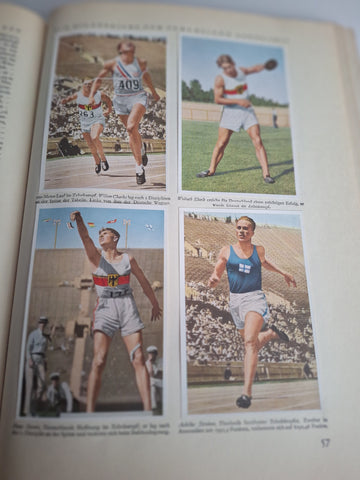 Very good German copy of 1932 Los Angeles Olympics, a comprehensive record of the Games with photos, text, results tables and a pull out chart at the back showing number of medals awarded. All the stickers are there and the overall condition is excellent for age, just one page slightly loose. 142 pages.