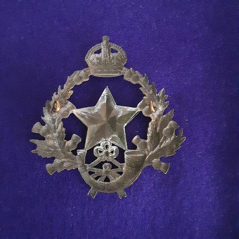 A nice original Officers pouch belt badge for the Cameronians Scottish Rifles Volunteer Battalion. The badge is brass with white metal and retains some of its gilt finish. Lugs on the reverse. The crown is King's Crown so it dates from 1902 to 1952.