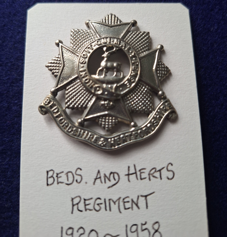 Very good original cap badge issued to the Bedfordshire and Hertfordshire Regiment (Beds and Herts), 1920 to 1958. The white metal badge has a slider on the reverse and is in excellent condition.