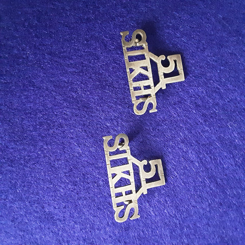 A rare original pair of silver plate shoulder titles with the regimental number '51' over the straight title 'Sikhs'. The origin of this regiment goes back to 1846 when Captain J S Hodgson raised the 1st Sikh Infantry following the 1st Sikh War. It was one of four Sikh Infantry regiments created to form the Frontier Brigade, named after the North West Frontier with Afghanistan and later became the Punjab Frontier Force in 1865. As part of the reorganisation of the Indian Army in 1903, the regimental name was changed to the 51st Sikhs (Frontier Force). It would undergo two more name changes and then be allocated to the Pakistan Army after Partition in 1947. (information from the National Army Museum). During the First World War the 51st Sikhs were involved in India, Aden, Egypt and Mesoptamia.
