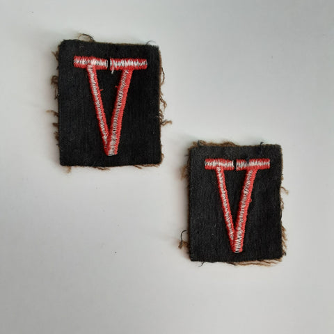 A very rare pair of exact matching formation patches issued to the Royal Northumberland Fusiliers, circa 1940 to 1950. The red 'V' is embroidered onto the khaki felt patch. In very good condition.